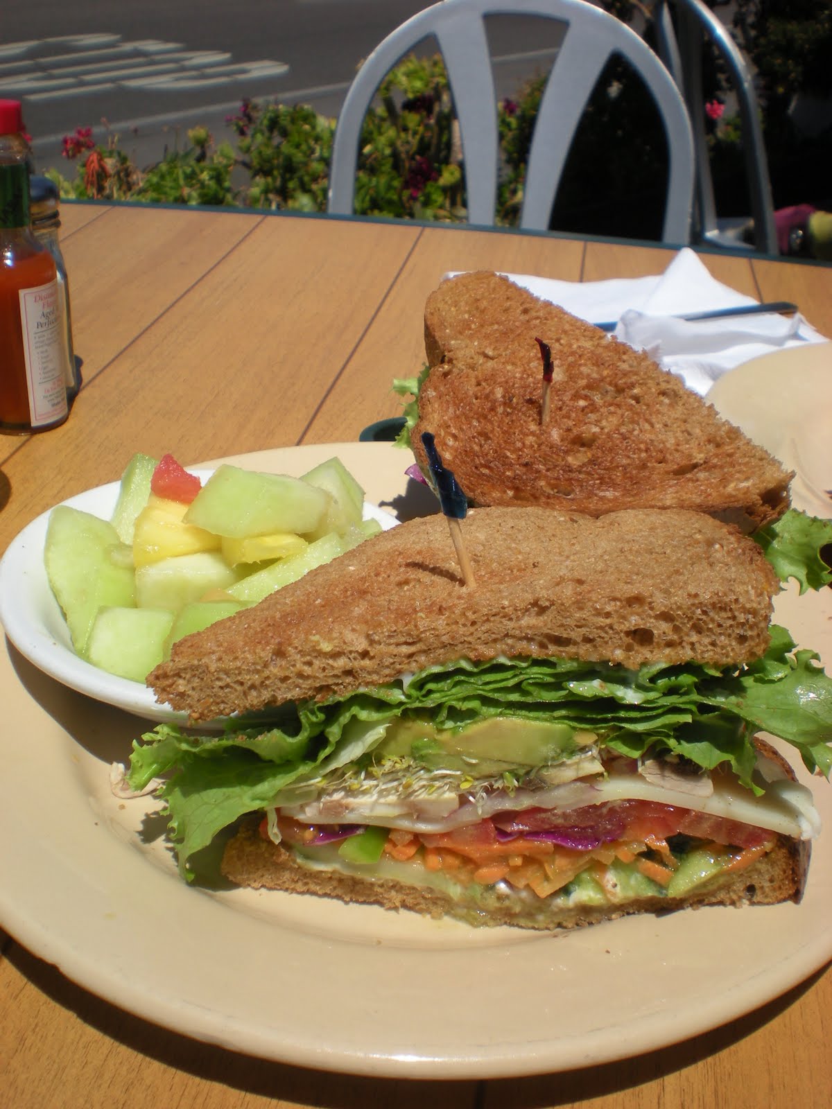 Lunch/Middag: Andra halvan av frukostmackan (fördelen med storleken på amerikanska portioner är att man nästan alltid får två måltider till priset av en.) Och färska bär och frukt från lokala grönsaksmarknaden. På balkongen.