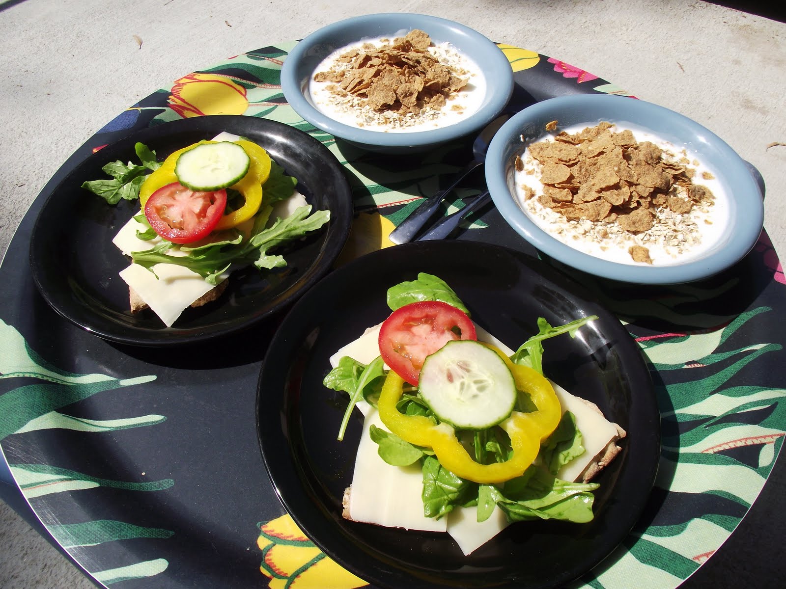 – åt vi svensk frukost i solskenet på altanen. Knäckebröd (här även känt som “cardboard bread”) med ost och grönsaker, samt filmjölk med havregryn. Bildbevis: